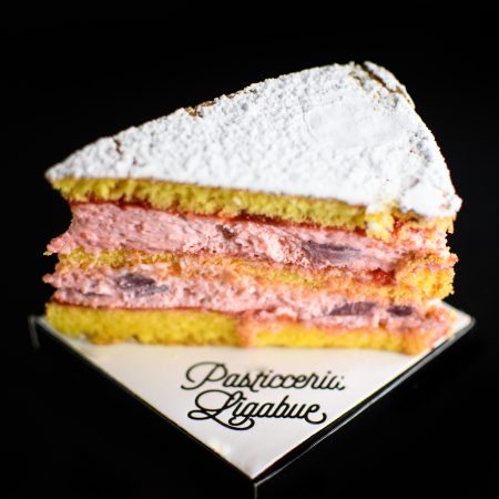 Ingredienti: fondo chiaro (uova, zucchero, farina, fecola, amido, lievito chimico, limone, vanillina) ricotta mista, panna fresca, farcitura fragola, fragole fresche, zucchero a velo
