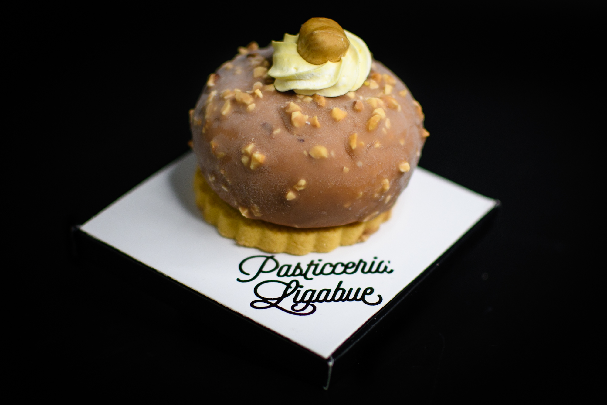 Ingredienti: bavarese alle nocciole ( latte, pasta di nocciole, tuorlo, zucchero, colla di pesce, granella di nocciole, panna fresca), sablonage al latte (cioccolato al latte 35%, olio di girasole, burro di cacao, granella di nocciole), base frolla (tuorlo, zucchero a velo, burro, farina 00, vanillina, sale, aroma di limone).