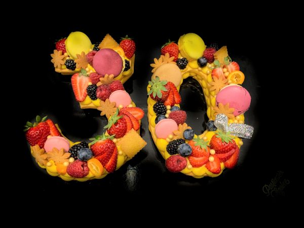 crema pasticcera (latte crudo, latte intero, panna fresca, tuorlo, sale, amido di mais, zucchero, vaniglia Tahiti), pasta frolla (farina 00, zucchero, burro, uova, sale, vanillina, aroma limone), frutta fresca, macarones.